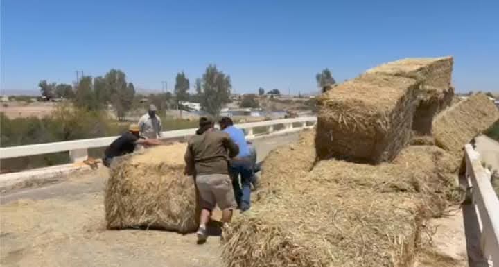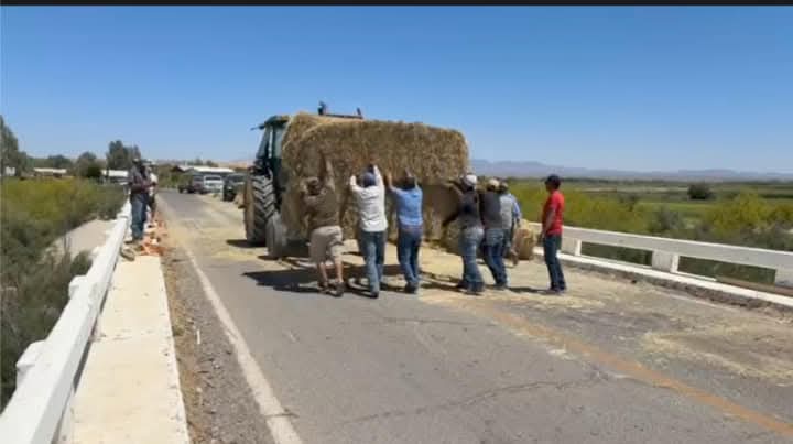 Un trailer que transportaba pacas de alfalfal al parecer por el peso de la carga este se «ladeó» y termino por caer de la plataforma quedando las pacas sobre la carretera justo en el puente antes mencionado.