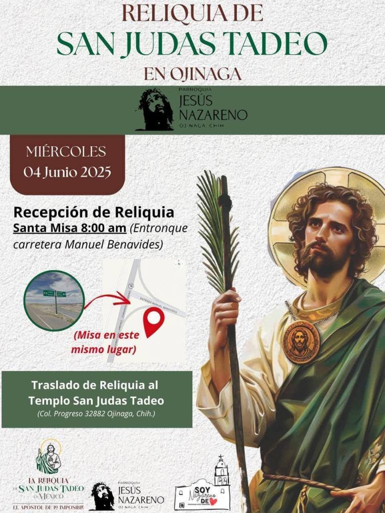 El 4 de junio contaremos con la visita de las reliquias de San Judas Tadeo en nuestras tierras. (Las reliquias estarán todo el día en la capilla de San Judas en la colonia Progreso).