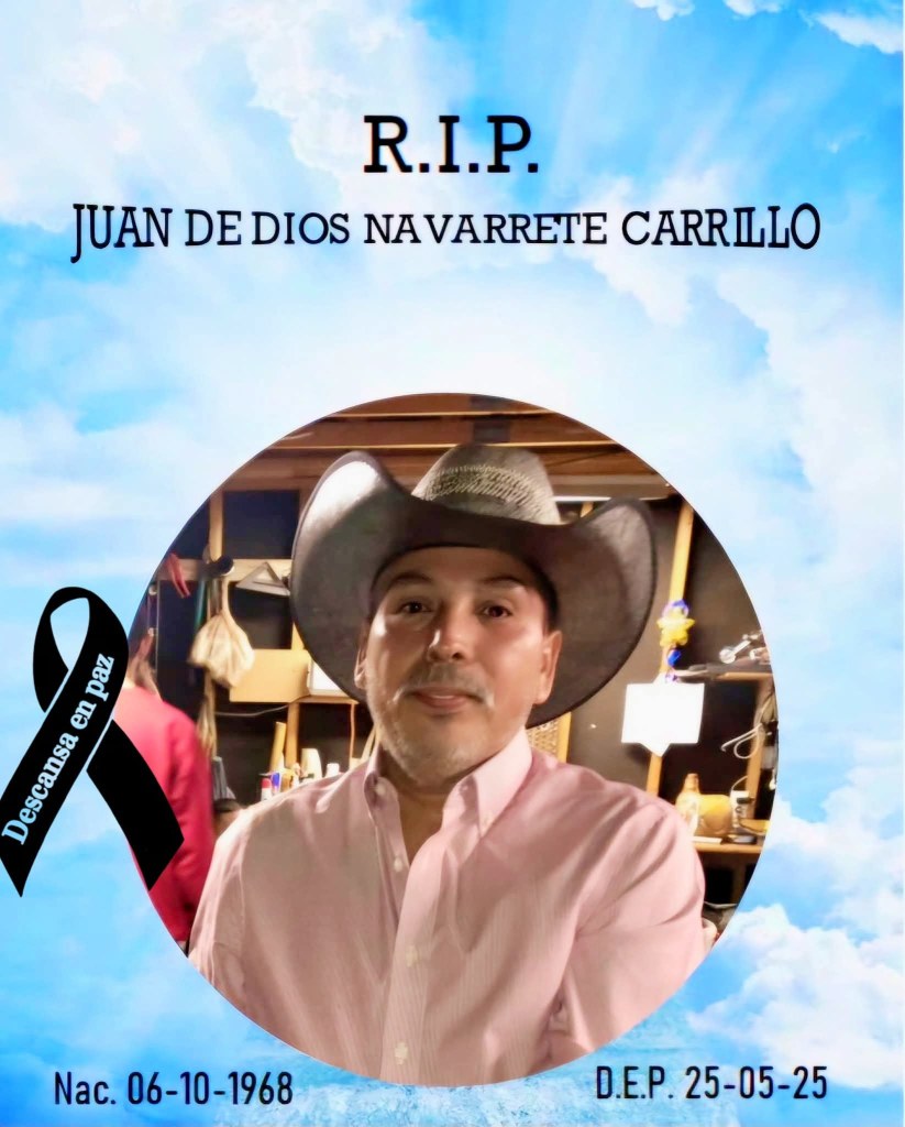 A familiares y amistades del señor Juan de Dios Navarrete Carrillo, se les comunica su sensible fallecimiento el día de hoy en Ojinaga, despues se avisará fecha y hora de sus funerales.