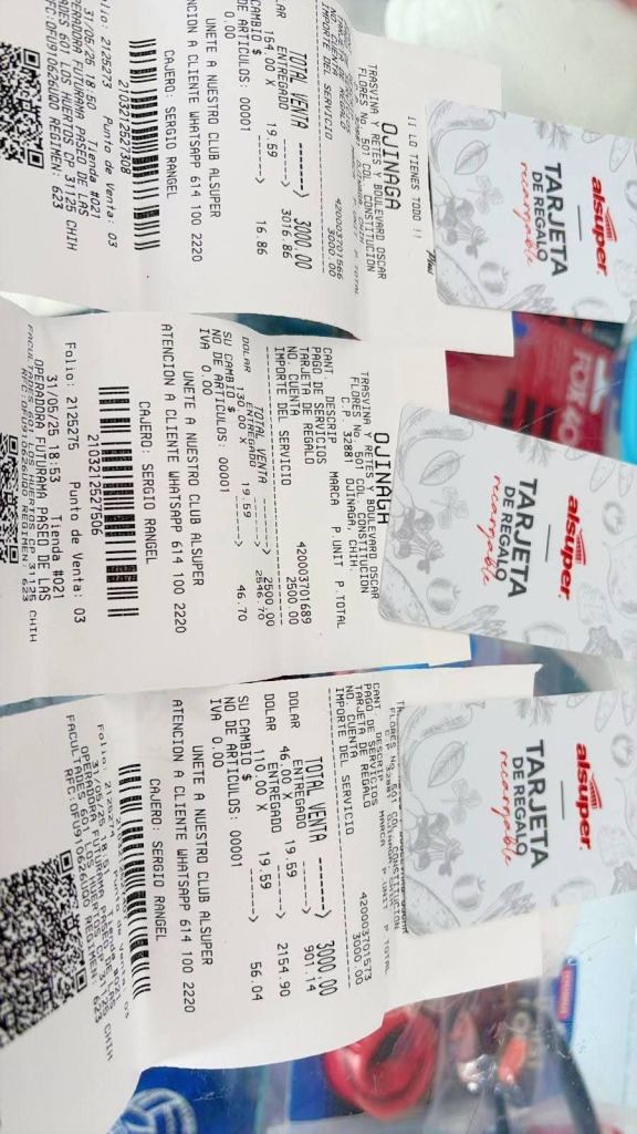 Los vales fueron entregados por el ing. Isidro (Chilo) Olivas en las instalaciones de Alsuper a donde acudieron las tres familias para recibir sus tarjetas y a la vez realizar su primera compra; Las beneficiadas del mes de junio son: Dalia Carbajal C. (2 niños), Perla Johana Herrera (4 niños) y Jaquelin Macías Pesquera (4 niños), mismas que realizaron su primera compra con mucha alegría.