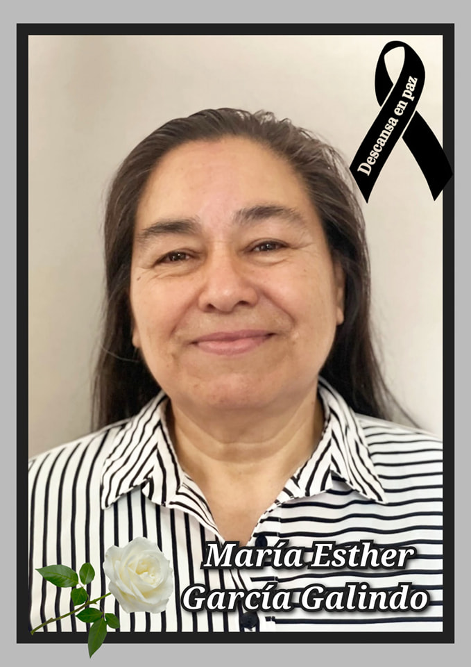 A familiares y amistades de la Sra. Maria Esther García Galindo, se les informa de su sensible fallecimiento a la edad de 63 años.