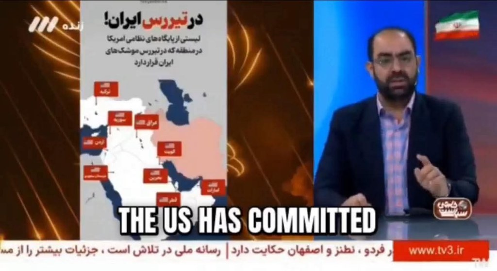La televisión estatal iraní emite un mapa de las bases militares estadounidenses en Oriente Medio, declarando: