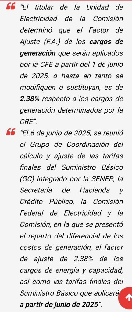 Publicó la CFE las tarifas finales del Suministro Básico, incluidas las de tarifas para uso doméstico de bajo consumo (DB), donde informa del aumento del 2.38% a partir de este mes de junio.