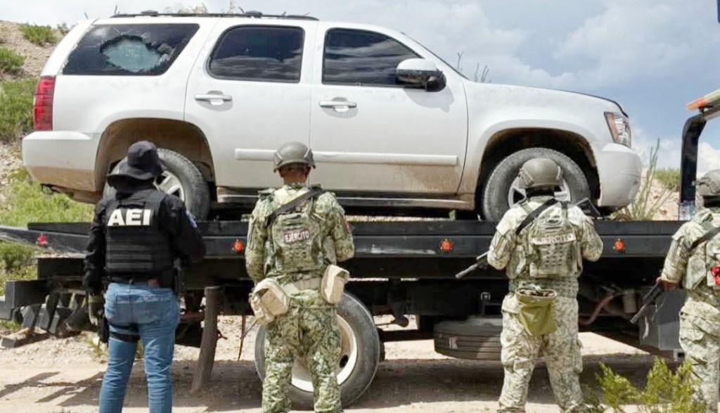 Ojinaga, Chih.— En un operativo coordinado entre la Agencia Estatal de Investigación (AEI) y el Ejército Mexicano, fue asegurado un vehículo Tahoe blindado con impactos de arma de fuego, en una brecha que conecta a las comunidades de La Estación y El Mulato, en el municipio de Ojinaga.