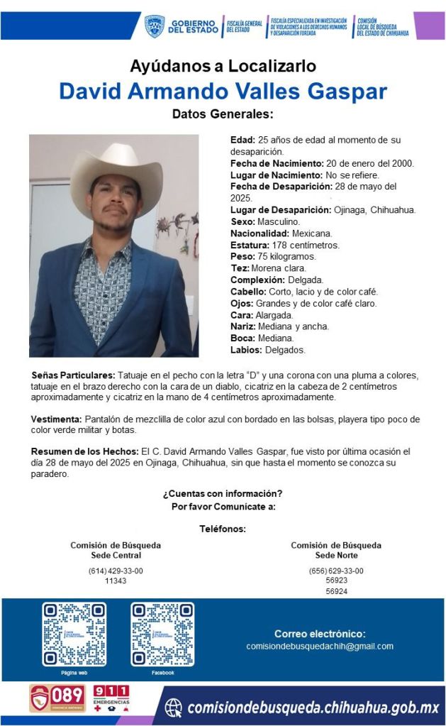 A través de los diferentes medios de comunicación, la Fiscalía General del Estado está solicitando el urgente apoyo de la población para localizar a David Armando Valles Gaspar, de 25 años de edad, quien desapareció en el Mpio. de Ojinaga, el 28 de mayo de 2025.