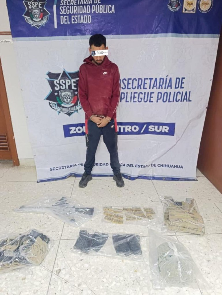 Como resultado de la intervención, se aseguró a un masculino identificado como Gerardo Márquez Galindo, de 26 años de edad, originario del municipio de Ojinaga, quien fue detenido por la posesión de un arma larga tipo fusil calibre 5.56, así como múltiples cargadores, cartuchos útiles, un chaleco táctico con placas balísticas y una bolsa con hierba verde y seca con las características propias de la marihuana.