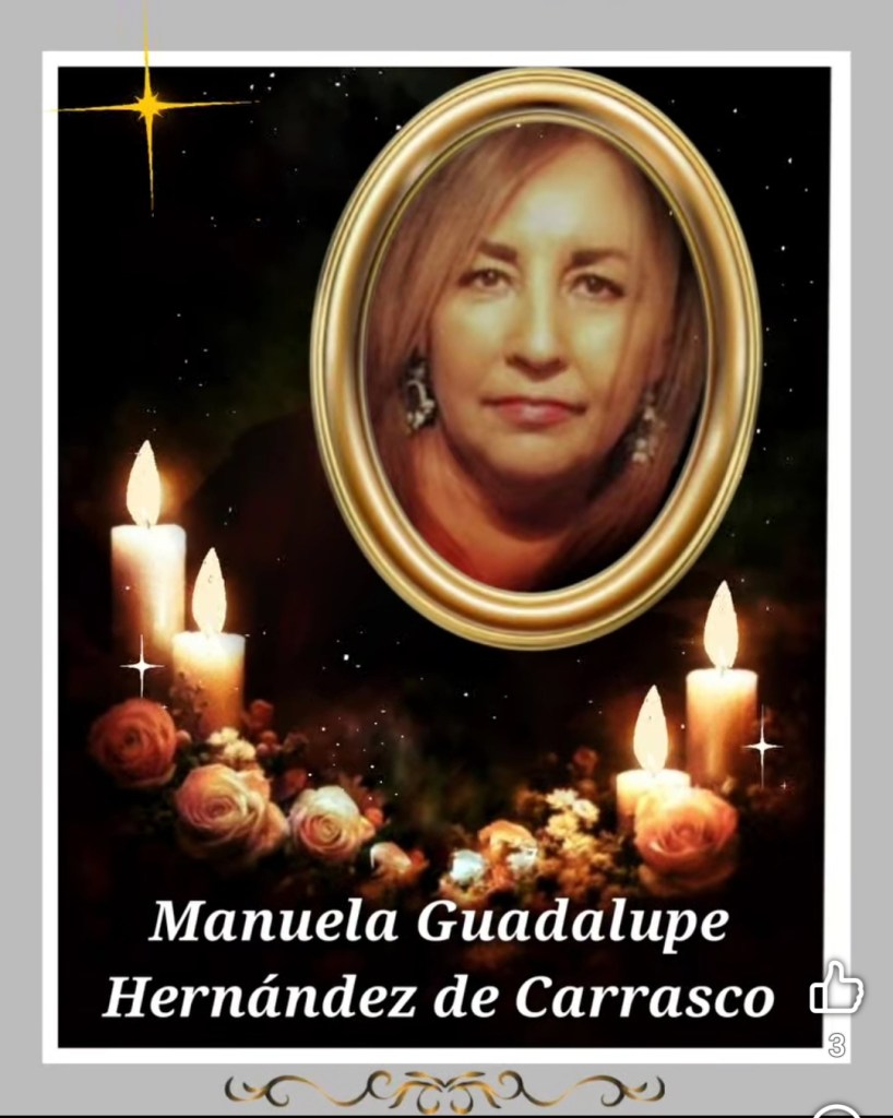 A familiares y amistades de la Sra. Manuela Hernández de Carrasco (Melín) se les comunica su sensible fallecimiento en Odessa a la edad de 59 años, Será trasladada hoy sábado a Ojinaga para ser velada a partir de las 6 de la tarde en el templo Monte Horeb. Después se informará día y hora de los servicios funerarios.
