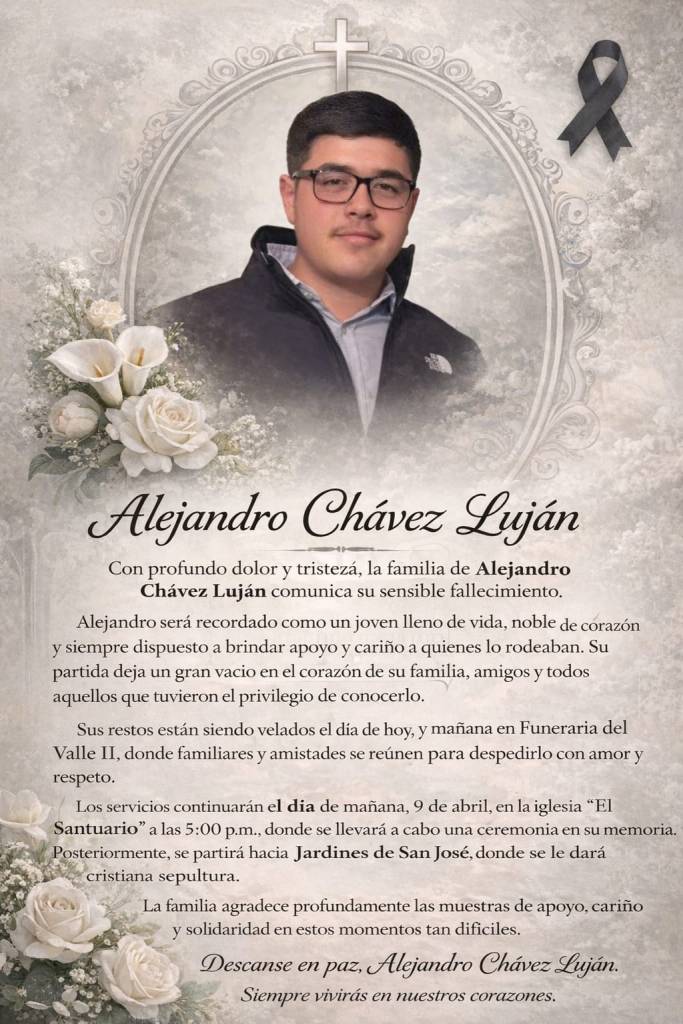 Su partida deja un gran vacio en el corazón de su familia, amigos y todos aquellos que tuvieron el privilegio de conocerlo. Sus restos están siendo velados el día de hoy, y mañana en Funeraria del ú Valle ll, donde familiares y amistades se reúnen para despedirlo con amor y respeto. Los servicios continuarán el dia de mañana con misa en el Santuario de Guadalupe a las 5:00 p.m., donde se llevará a cabo una ceremonia en su memoria. Posteriormente, se partirá al panteón Jardines de San José. Lafamilia agradece profundamente las muestras de apoyo, cariño y solidaridad en estos momentos tan dificiles.