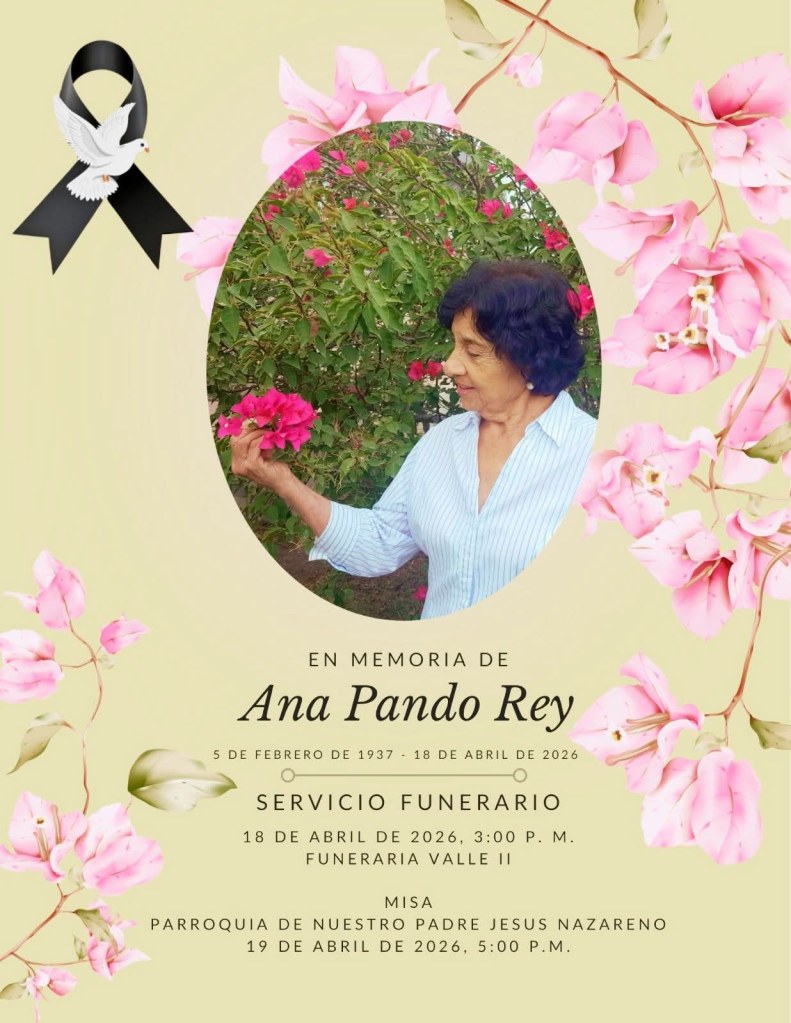 Con profundo dolor y tristezá participamos el sensible fallecimiento de la Sra. Ana Pando Rey el día de hoy a la edad de 89 años en Ojinaga.