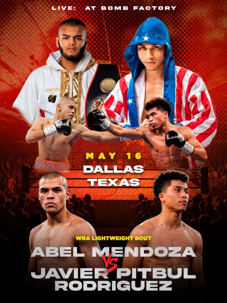 La Pelea estelar contra el excampeón latino de la Asociación Mundial de Boxeo Javier Pitbul Rodriguez se llevará a cobo el próximo 16 de Mayo en Dallas, Texas. Abel Mendoza ha representado a Ojinaga y a Mexico en torneos internationales amateur. Uno de sus peleadores favoritos era Tomas «El Norteño» Villa.