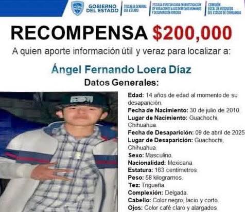 «Buenas tardes, quiero pedirle su apoyo para buscar a mi hijo,se llama Ángel Fernando Loera Díaz, de 15 años, yo solo quiero que las personas que se lo llevaron, me lo regresen o me digan en dónde está y yo voy por él, no busco culpables, lo único que quiero es encontrar a mi niño, a él se lo llevaron de Aldama, ya pasaron 9 meses y estoy desesperada».