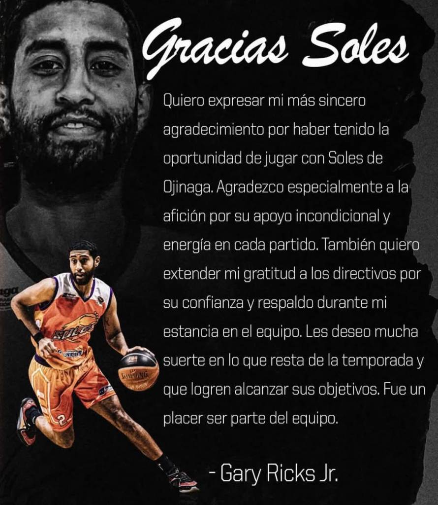 «Quiero expresar mi más sincero agradecimiento por haber tenido la oportunidad de jugar con Soles de Ojinaga. Agradezco especialmente a la afición por su apoyo incondicional y energía en cada partido. También quiero extender mi gratitud a los directivos por su confianza y respaldo durante mi estancia en el equipo. Les deseo mucha suerte en lo que resta de la temporada y que logren alcanzar sus objetivos».