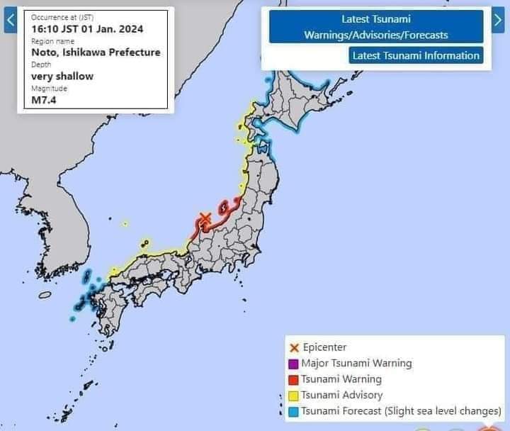 El nuevo año 2024 inició en Japón con un potente terremoto de magnitud 7.5, con epicentro en el mar de Japón, en una zona de colisión de placas tectónicas al norte de Nagoya, al noreste de Osaka, al noroeste de Tokio, y al suroeste de Niigata, el cual fue sentido en todo Japón.