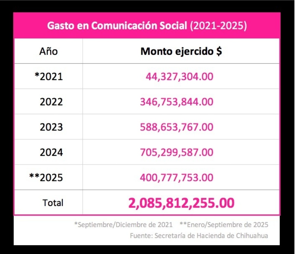 Datos: De septiembre de 2021 (cuando inició su gestión como gobernadora) a septiembre de 2025, Campos Galván gastó 2 mil 085 millones 812 mil 255 pesos en comunicación social de la siguiente manera, de acuerdo con los informes oficiales de la Secretaría de Hacienda: