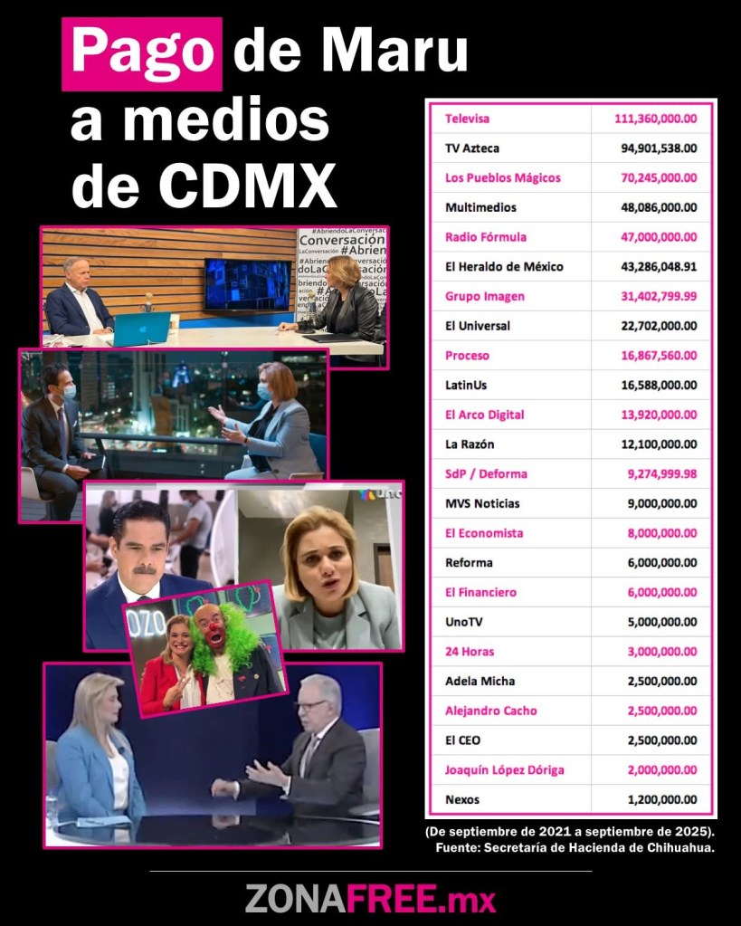Medios cooptados: Los siguientes son ejemplos de los principales pagos realizados a los medios por Campos Galván, de septiembre de 2021 a septiembre de 2025, de acuerdo con datos oficiales de la Secretaría de Hacienda, conforme a los respectivos contratos: