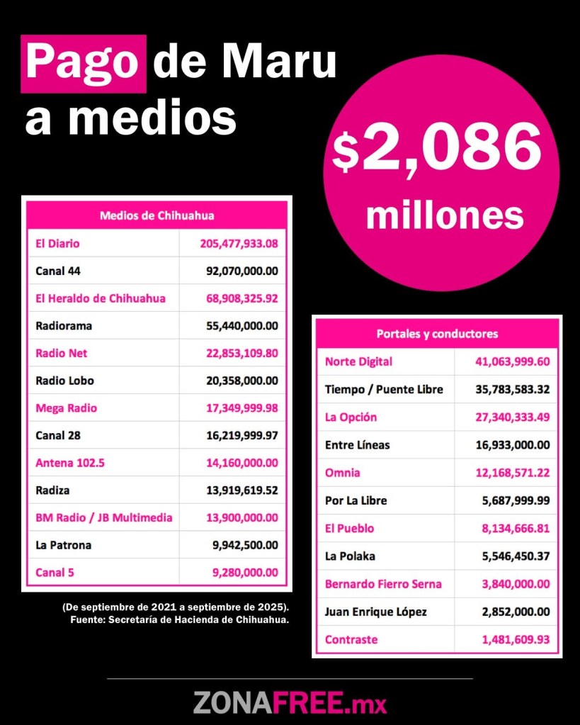 La gobernadora controla el manejo informativo de casi todos los medios en el estado de Chihuahua, mediante convenios publicitarios en televisión, radio, medios impresos y digitales, cine, carteleras y pagos a conductores.