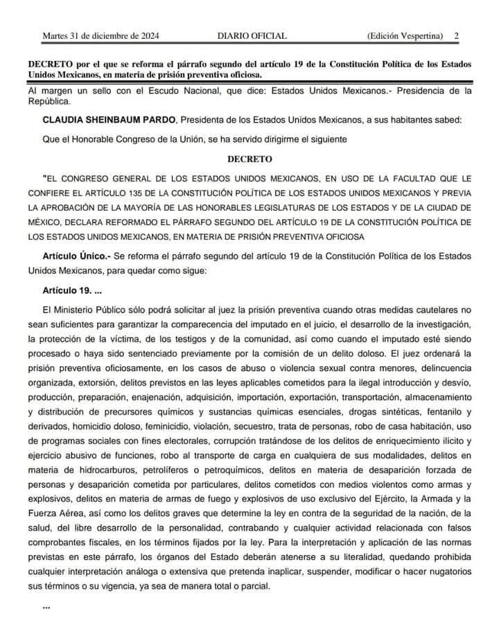 La reforma en materia de prisión preventiva oficiosa fue publicada en el Diario Oficial de la Federación (DOF) la noche del 31 de diciembre de 2024, entrando en vigor a partir de este 01 de enero de 2024.