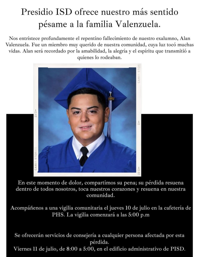 La familia de Alan Valenzuela expresa su más sincero agradecimiento a todos los que nos han brindado apoyo durante estos momentos difíciles. Ya sea con oraciones, su presencia o cualquier tipo de ayuda, su generosidad ha sido fundamental para nosotros.