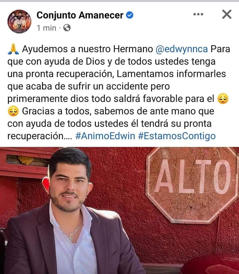 Ojinaga, Chih.- Este jueves 2 de Marzo del año en curso, a través de la página oficial de Conjunto Amanecer, se dió a conocer que Edwin Madrid había tenido un accidente, que al parecer las heridas que había sufrido el cantante, fueron externas, pero de cualquier forma solicitaban las oraciones del público para que todo saliera bien, hasta el momento no se a dado información concreta de que fue lo que pasó, pero le deseamos que todo esté bien.