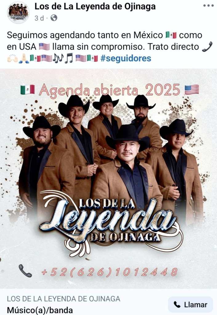 Ojinaga por más de 4 décadas ha sido un semillero de grupos musicales a tal grado que nos han llamado tierra de músicos, o la capital mundial de la música norteña, gracias a las agrupaciones emanadas de esta tierra que nos han representado dignamente… hoy estamos siendo testigos de un nuevo lanzamiento musical… que gracias a su empeño, dedicación, disciplina y constancia prometen seguir poniendo el nombre de Ojinaga en lo alto… “Los De La Leyenda de Ojinaga”, grupo que se establece en el mes de febrero de este año 2025, con su pasión por la música y el firme propósito de seguir cosechando éxitos como lo hicieron en otras agrupaciones a las que pertenecieron de manera individual y grupal… Bajo el liderazgo de Efrain Lujan Chavez, hoy nace un nuevo concepto musical integrado por talentosos jóvenes que vienen abriendo brecha en el género del Norteño – Sax, género musical representativo no solo de Ojinaga sino también del estado de chihuahua.