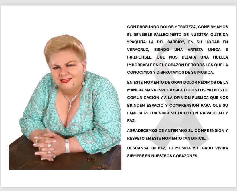 SE MURIÓ PAQUITA Fallece Paquita la del Barrio a los 77 años, gran exponente de la música del regional mexicano, la icónica cantante que llamó “ratas de dos patas” a los infieles. Francisca Viveros Barradas, mejor conocida como Paquita la del Barrio, falleció dejando un legado en la música popular mexicana. Nacida en Veracruz en 1947, desde niña mostró su talento para el canto. Con su estilo único, se convirtió en una voz inconfundible contra el machismo y la traición. Q.E.P.D.