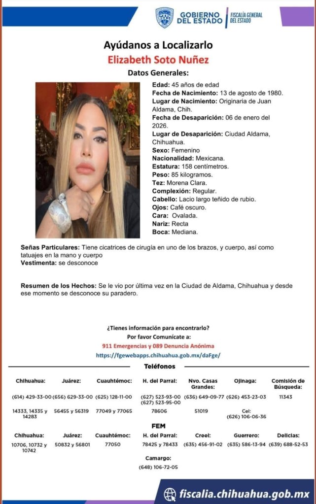 La Fiscalía General del Estado dio a conocer que los cuerpos de dos hombres y una mujer que fueron encontrados a un costado de la carretera que conduce de Aldama a Ojinaga, son los de Elizabeth, de 45 años de edad, Abel, de 36, e Israel Soto Núñez, de 35 años.