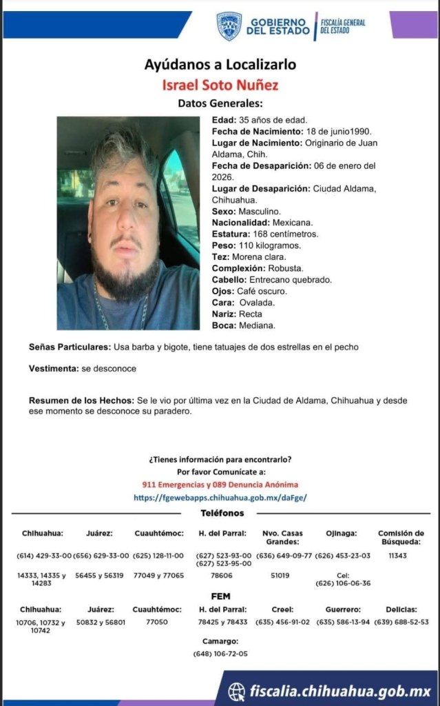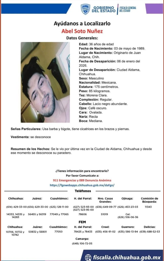 Los tres desaparecieron desde la madrugada del pasado martes 6 de enero, un par de horas antes de amanecer en la ciudad de Aldama. Se menciona que fueron «levantados» por un grupo de personas armadas.