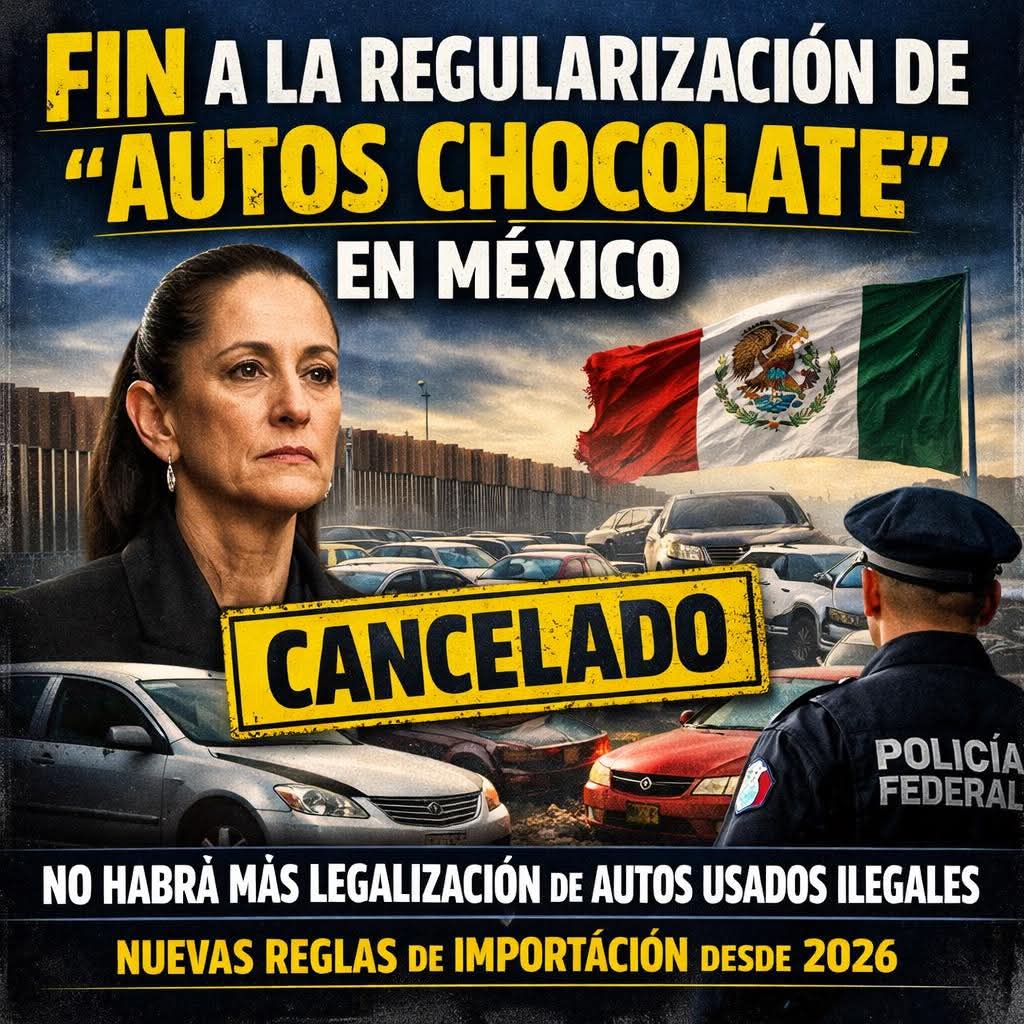01 de enero de 2026 — El gobierno federal, encabezado por la presidenta Claudia Sheinbaum Pardo, oficializó el fin del programa que permitía la regularización simplificada de vehículos usados importados irregularmente desde Estados Unidos y Canadá, conocidos como “autos chocolate”. La medida fue publicada en el Diario Oficial de la Federación el 31 de diciembre de 2025 y entra en vigor a partir del 1 de enero de 2026.