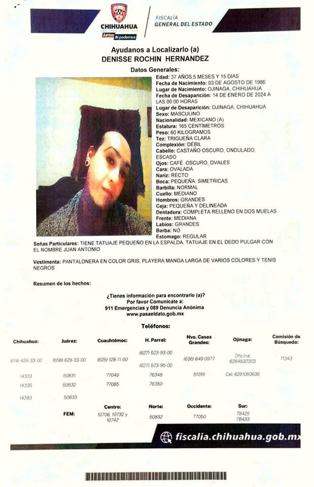 La fiscalía del estado con sede en Ojinaga está realizando una investigación para la localización de DENISSE ROCHIN HERNÁNDEZ quien fue vista por última vez en la ciudad de Ojinaga el pasado 14 de enero de 2024 y desde ese momento se desconoce su paradero.