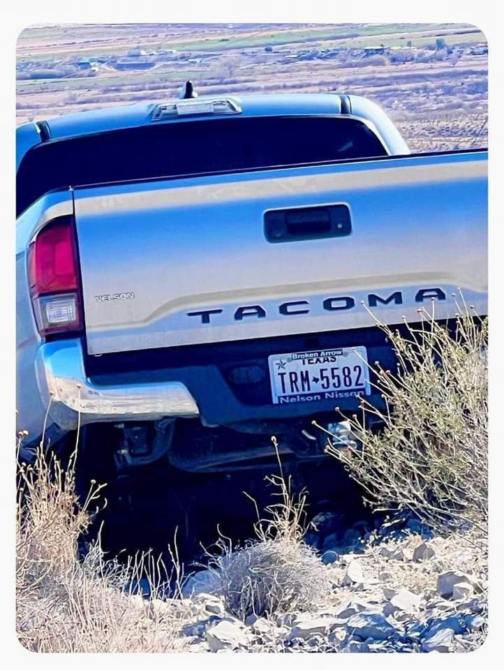 El vehículo es una pick up Toyota Tacoma color gris con placas del estado de Texas, de acuerdo con información en redes sociales este vehículo pudo haber sido sustraído de la comunidad de cuchillo Parado.