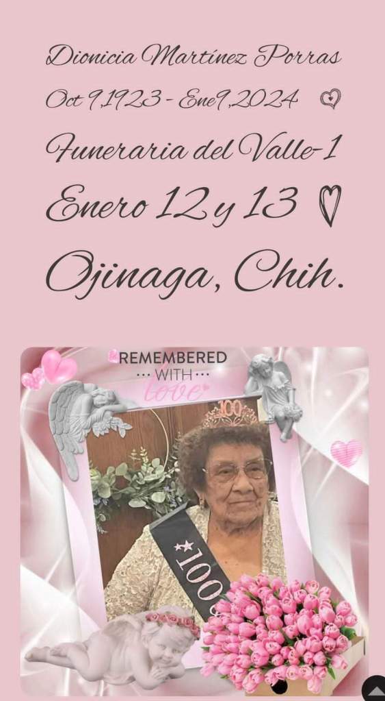 «Fuiste una luz de amor en todos los que te conocieron». La Sra. Dionicia Martínez Porras, murió en paz el día 9 de enero en Odessa, Tex., a la edad de 100 años. Fue una mujer de profunda fe, vivió un siglo de vida al máximo, celebrando con alegría cada momento, y siempre tenía una palabra para confortar. Ella fue la matriarca de una familia numerosa y muy unida. Les dio fuerza y guía a sus hijos, nietos, bisnietos y dos generaciones más. Nicha fue precedida por su esposo Daniel Porras, sus padres Andrés Martínez y Felícitas Cortez Gaytán, así como de sus hijos Amada, Abelino, David y Juan Porras ✝️ Su legado continúa con sus hijos que le sobreviven, Socorro, Eva, Francisca, Oscar y Rey Porras. Su vida fue un testimonio del poder de la Fe en Dios y su habilidad de disfrutar con los más simples placeres de la vida, enfrentando la adversidad con una sonrisa y amar sin condición a sus familiares y amistades.