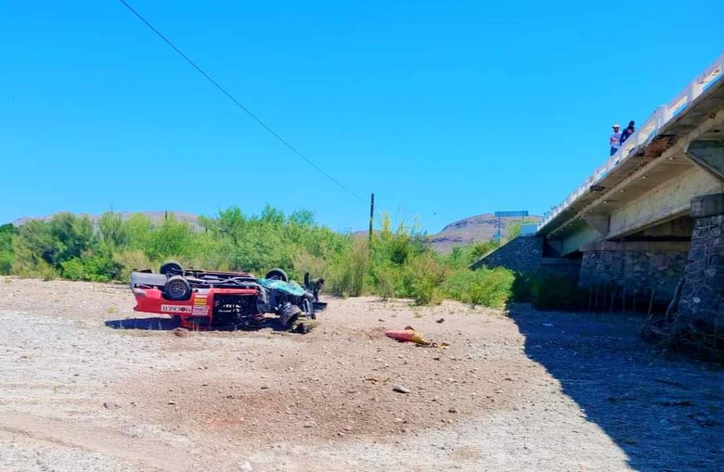 Atiende personal de rescate de CRUZ ROJA chihuahua volcadura de un auto que participaba en el rally Chihuahya express. El accidente se registró en un puente antes de llegar a la sierra del Pegüis; El conductor presenta probable fractura en cubito, radio lado izquierdo y clavícula mismo lado, así mismo heridas en mano derecha.El Copiloto dolor abdominal, cuadrante superior e inferior lado derecho.